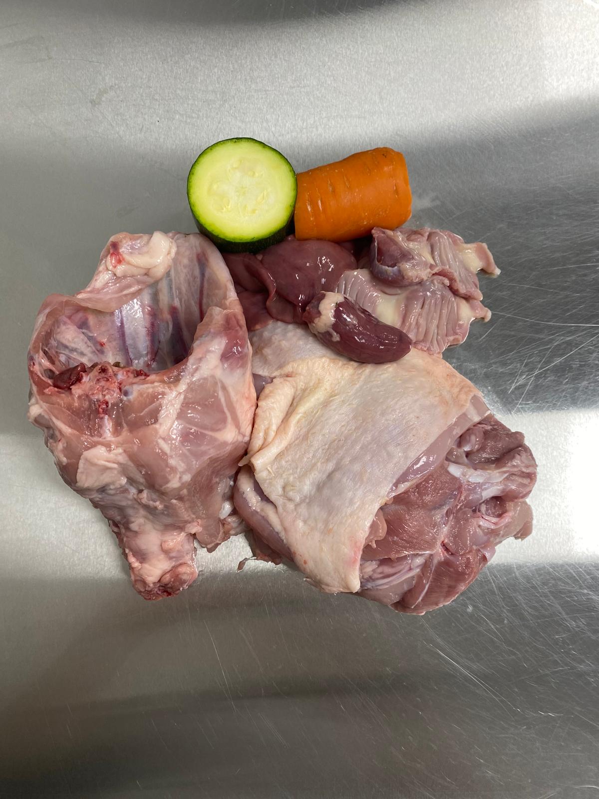 Menú BARF 100% natural con pechuga y carcasa de pollo (80%), vísceras variadas (10%) y vegetales (10%). Sin cereales ni aditivos. Perfecto para perros de todas las edades.