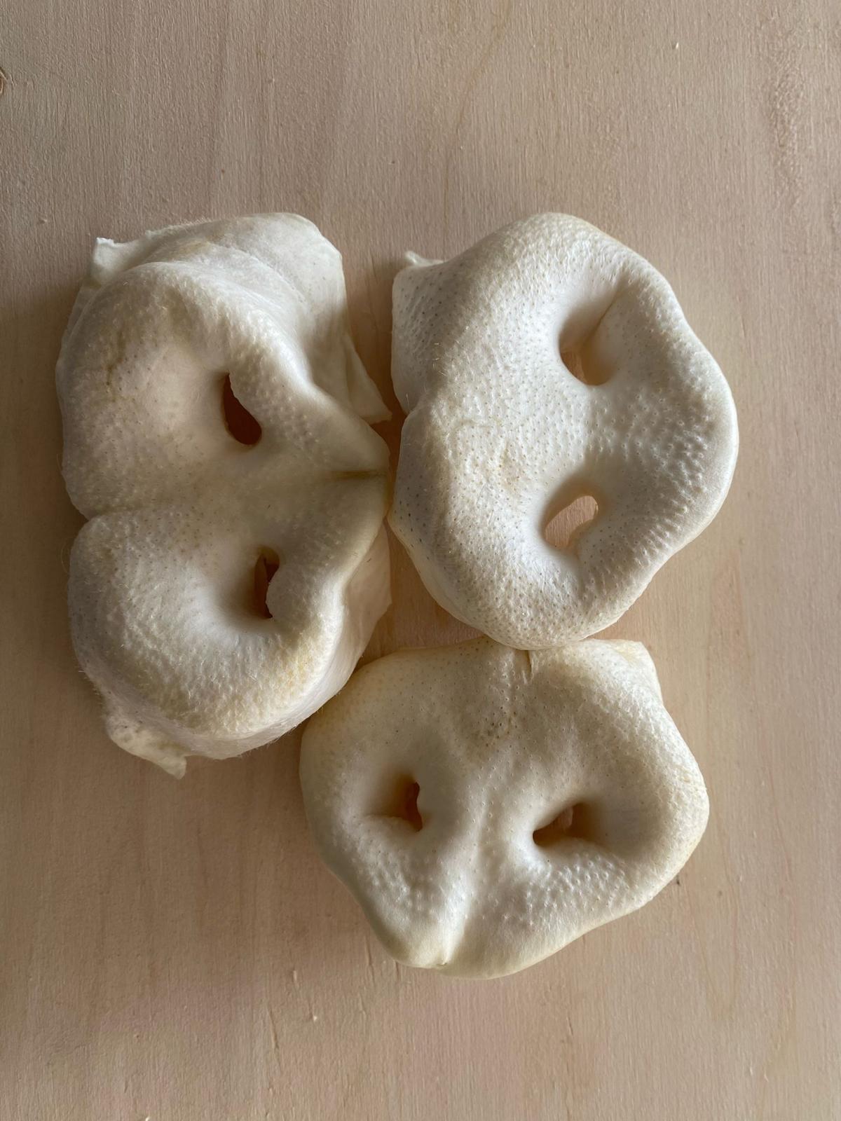 Tiene una textura suave y un olor muy leve, lo que lo convierte en un premio fácil de masticar y muy apetecible. Cada unidad mide entre 8-10 cm de largo y 5-7 cm de ancho, con un peso aproximado de 70-80 g por 5 piezas.