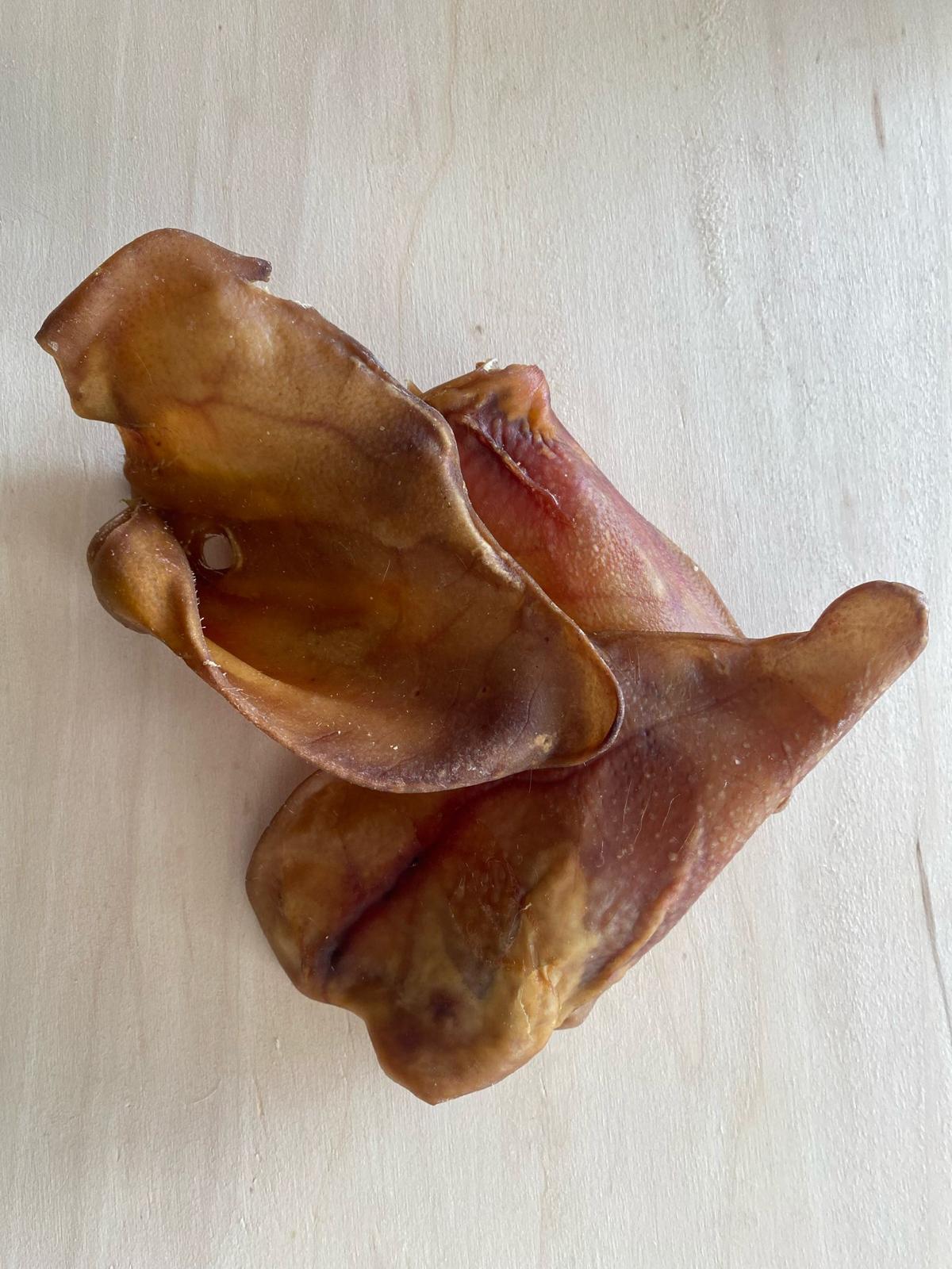 Orejas de cerdo deshidratadas, 100% naturales, con una textura dura y un contenido medio-alto en grasa, perfectas para una masticación prolongada.