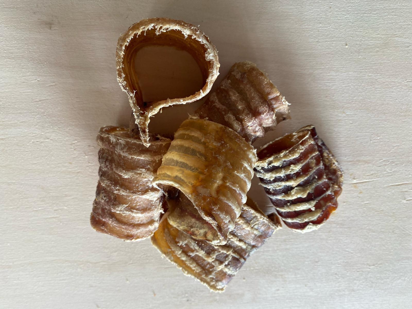 La tráquea de ternera tamaño S es un snack natural con una textura media y un alto nivel de proteína (69,1%), ideal para una masticación duradera. Su contenido de grasa (10,9%) lo convierte en un premio nutritivo y sabroso.